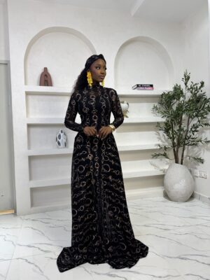 A maxi velvet mesh dress. Comes fully lined. 66 inches long.