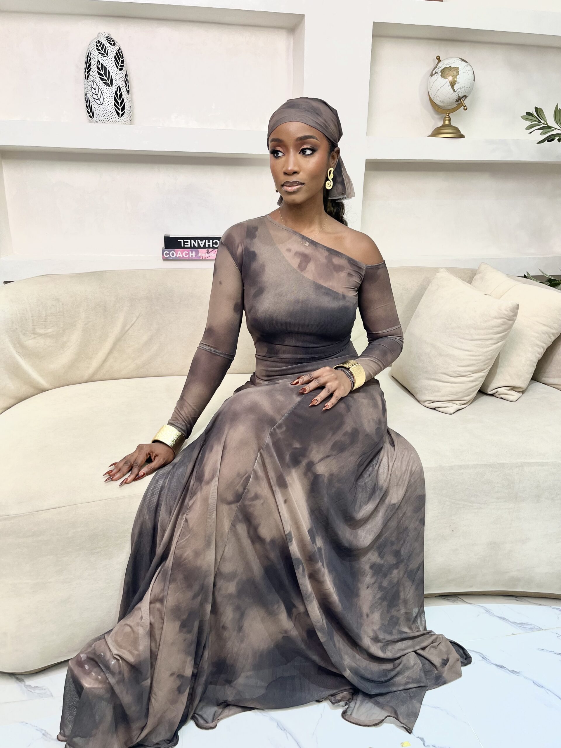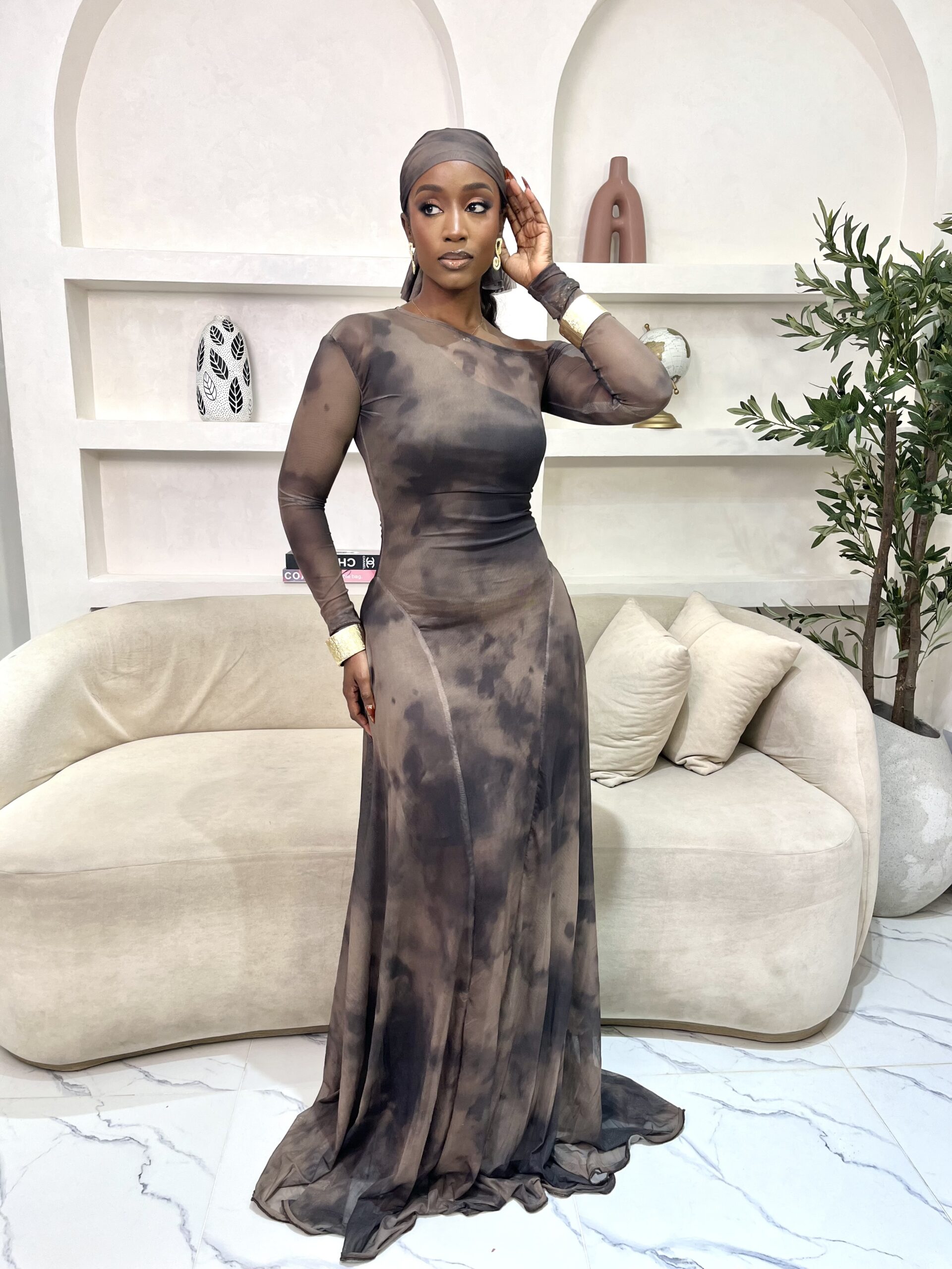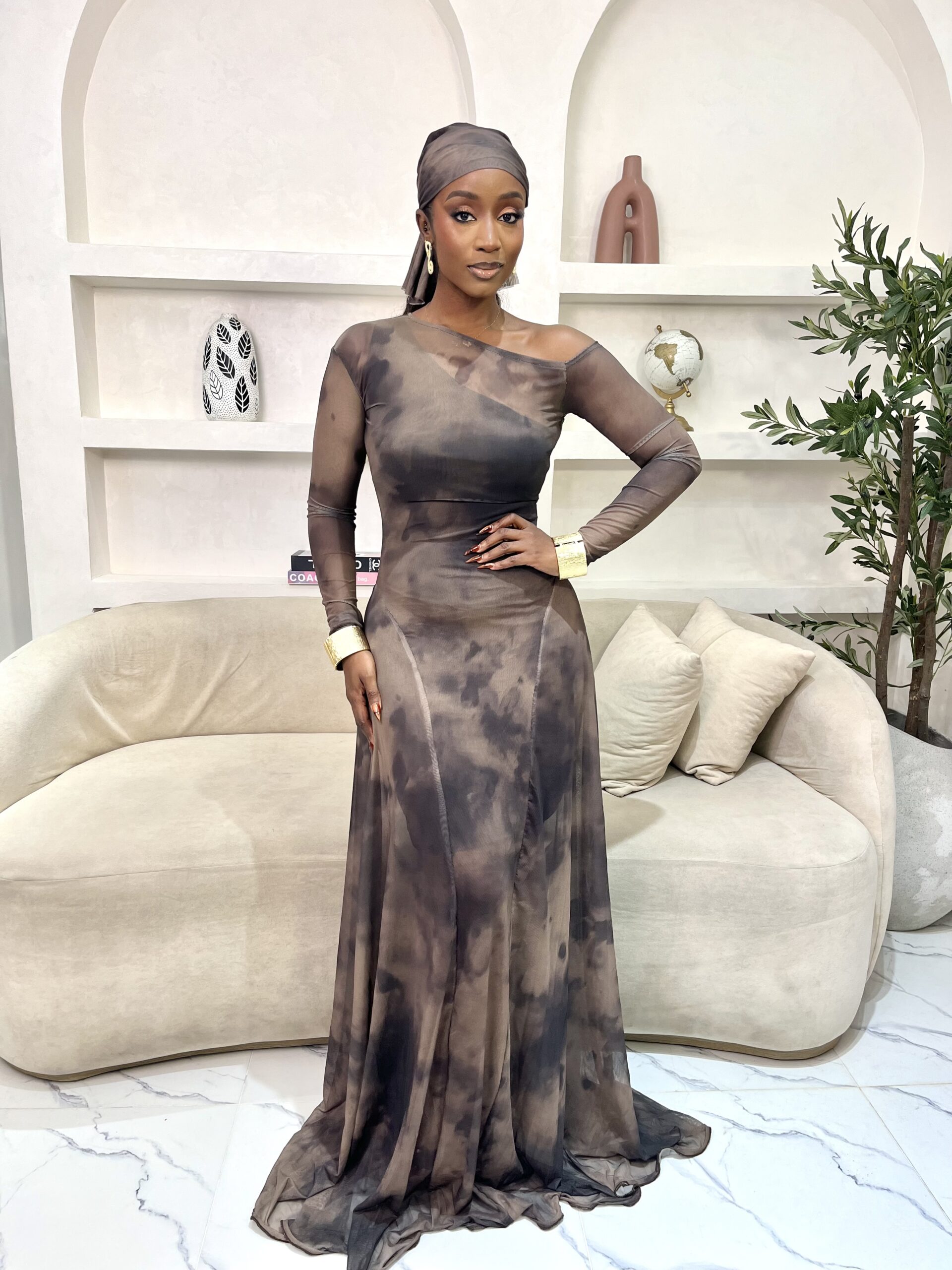 A maxi mesh dress. Comes with an inner dress. 65 inches long.