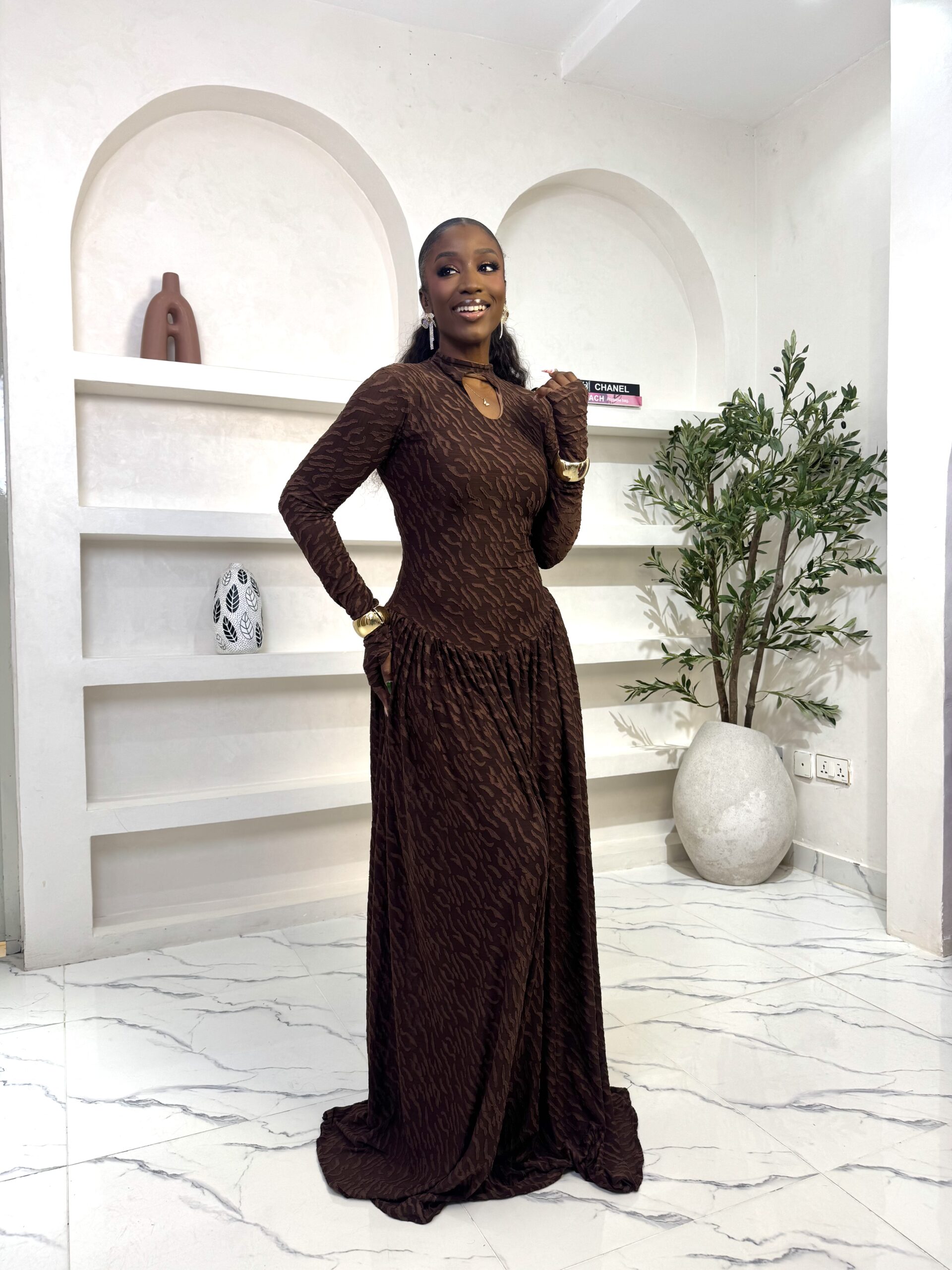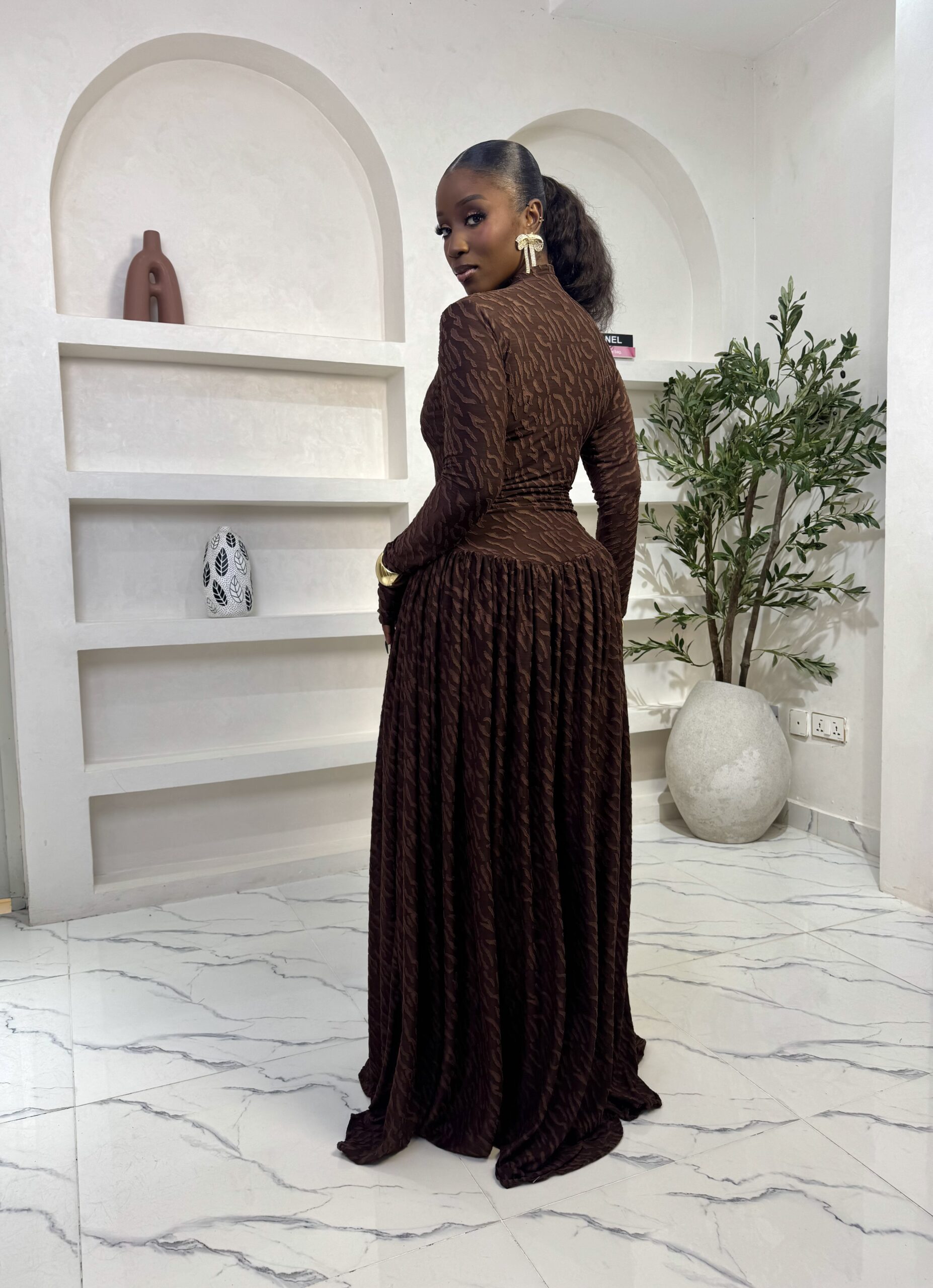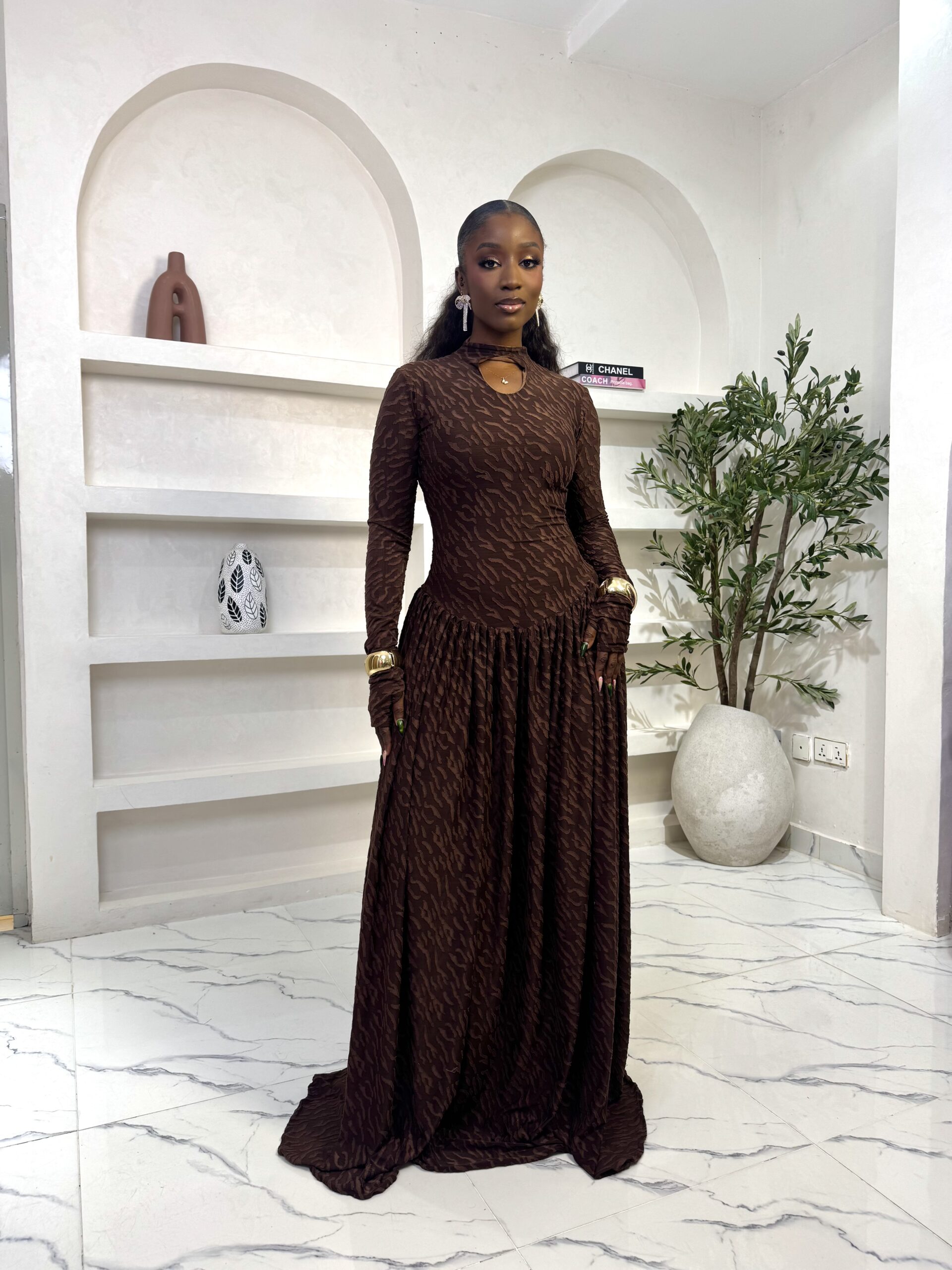 A maxi velvet mesh dress. Comes fully lined. 66 inches long.