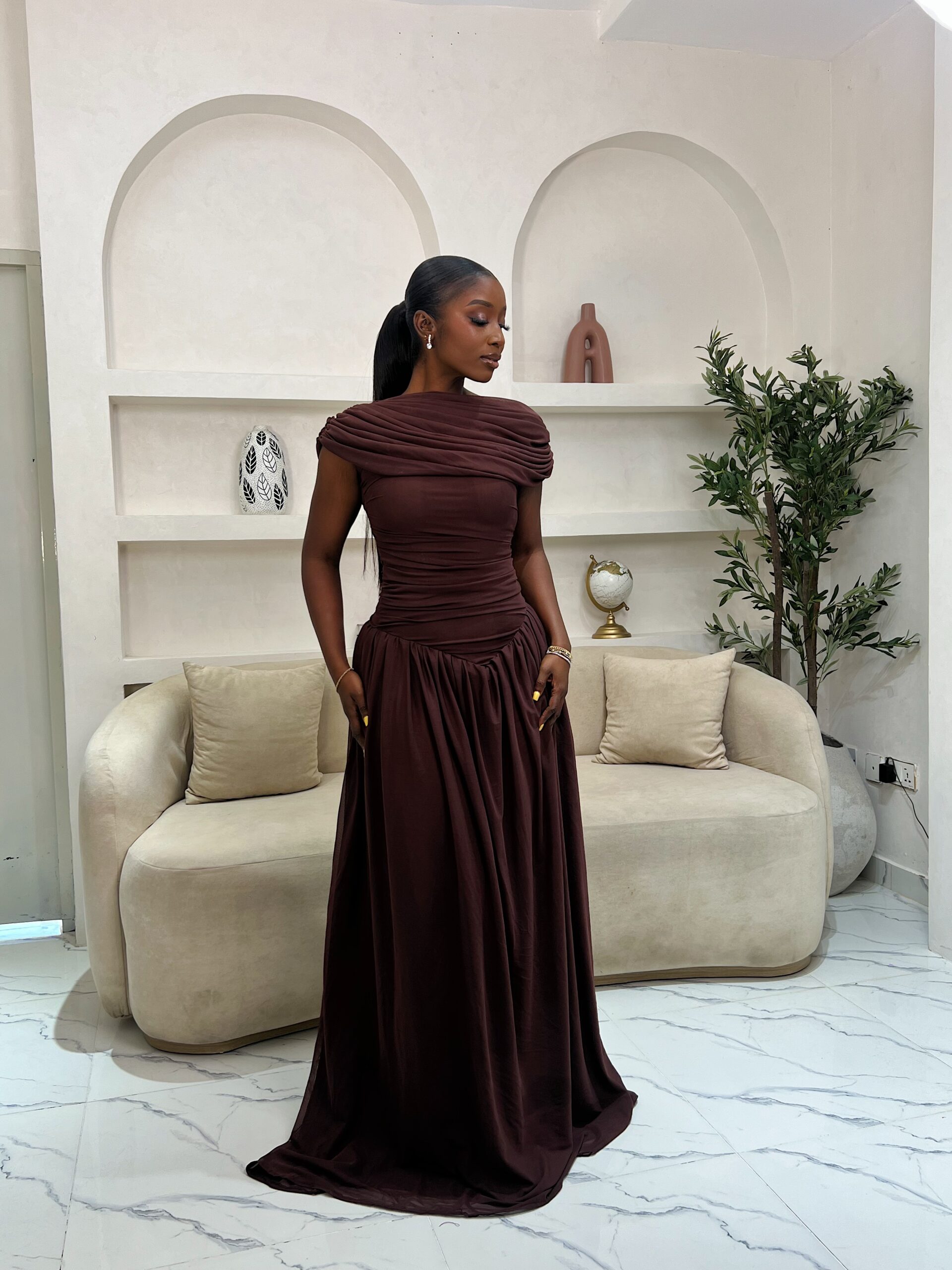 A fully lined mesh maxi dress. It’s 65 inches long. Very detailed dress